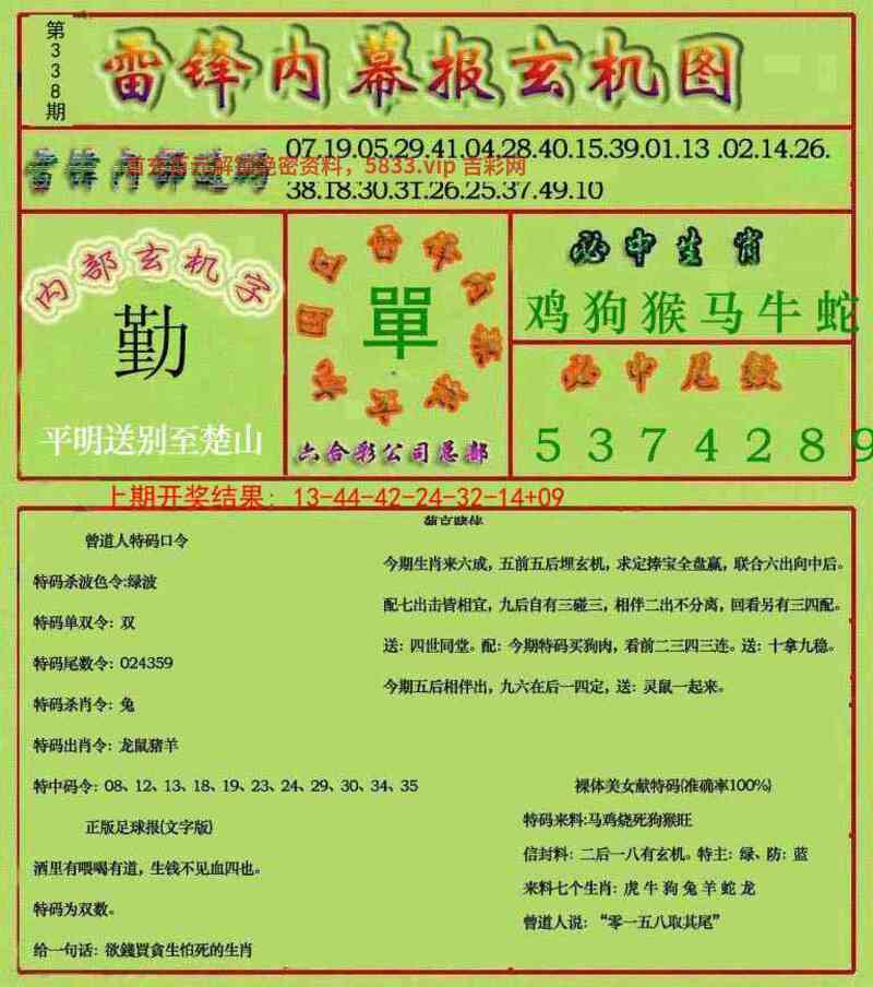 | 338期 | 羊猪牛鸡蛇兔 | 狗08错 |